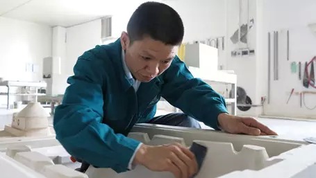 楊建強是恒潔衛(wèi)浴產(chǎn)品研發(fā)中心陶瓷模具開發(fā)技術(shù)師傅,今年42歲的他在恒潔已經(jīng)工作了12年。作為資深的技術(shù)師傅,陶瓷模具的制作在他眼里,已經(jīng)不僅是一門手藝活,更是一件需要自己用心去打磨、雕琢的作品。