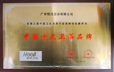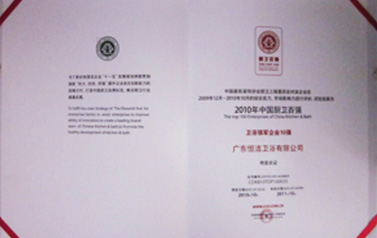 恒潔衛(wèi)浴榮獲由中國建筑裝飾協(xié)會廚衛(wèi)工程委員會頒發(fā)的“2009年度中國廚衛(wèi)百強衛(wèi)浴領(lǐng)軍企業(yè)10強“稱號。