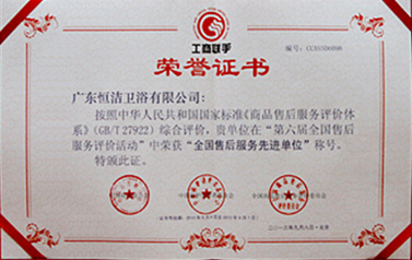 憑借“1350陽光服務(wù)體系”,恒潔衛(wèi)浴被授予“全國售后服務(wù)先進(jìn)單位”稱號。