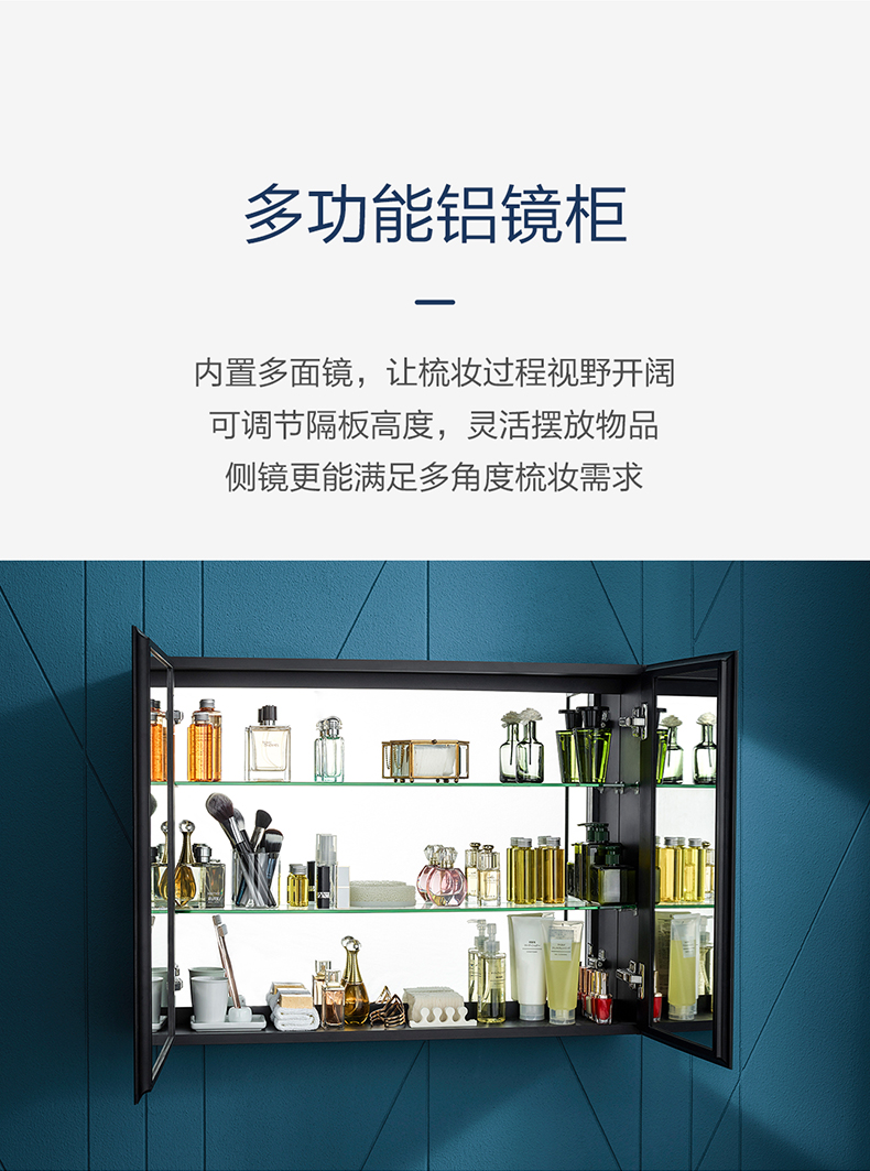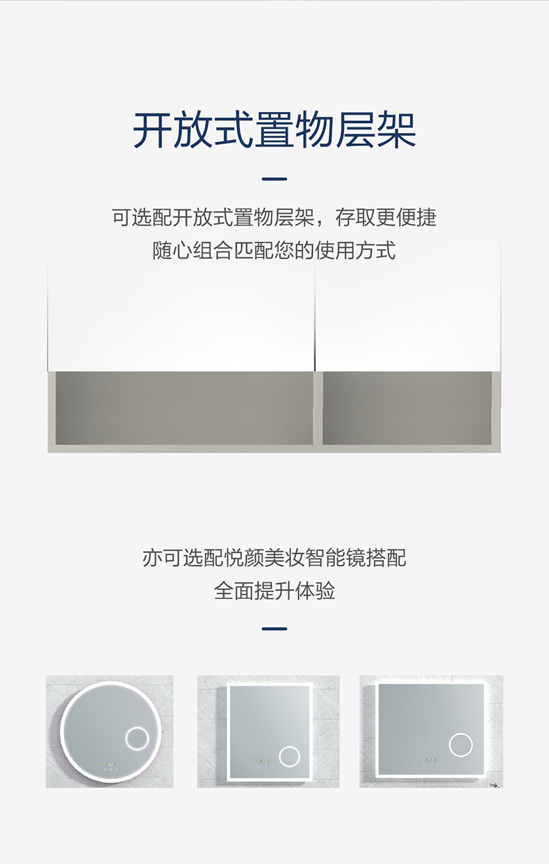 多功能鋁鏡柜:標配多功能鋁鏡柜,可升級為二代鋁鏡柜,或選配悅顏智能鏡搭配,全面提升體驗;可選配開放式活動鏡層架,存取更便捷;