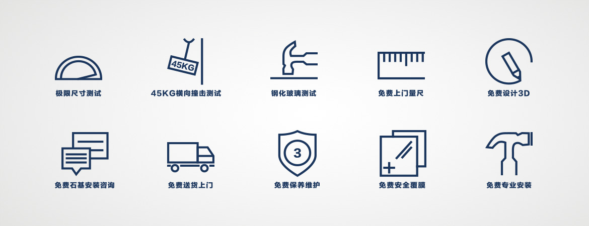 我們對每一片玻璃都進行全鋼化并安全覆膜保護,確保產品結構牢固并經得起外力和時間的考驗。